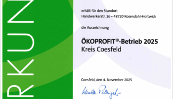 Wir freuen uns über unsere erfolgreiche Teilnahme am Nachhaltigkeitsprogramm ÖKOPROFIT des Kreises Coesfeld. Dieses Programm unterstützt Unternehmen dabei, ihre Umweltleistung zu verbessern, Ressourcen zu schonen und Kosten zu senken. Durch unsere Teilnahme konnten wir zahlreiche Maßnahmen zur Energieeinsparung, Abfallvermeidung und Effizienzsteigerung umsetzen. Damit leisten wir nicht nur einen aktiven Beitrag zum Umwelt- und Klimaschutz, sondern […]